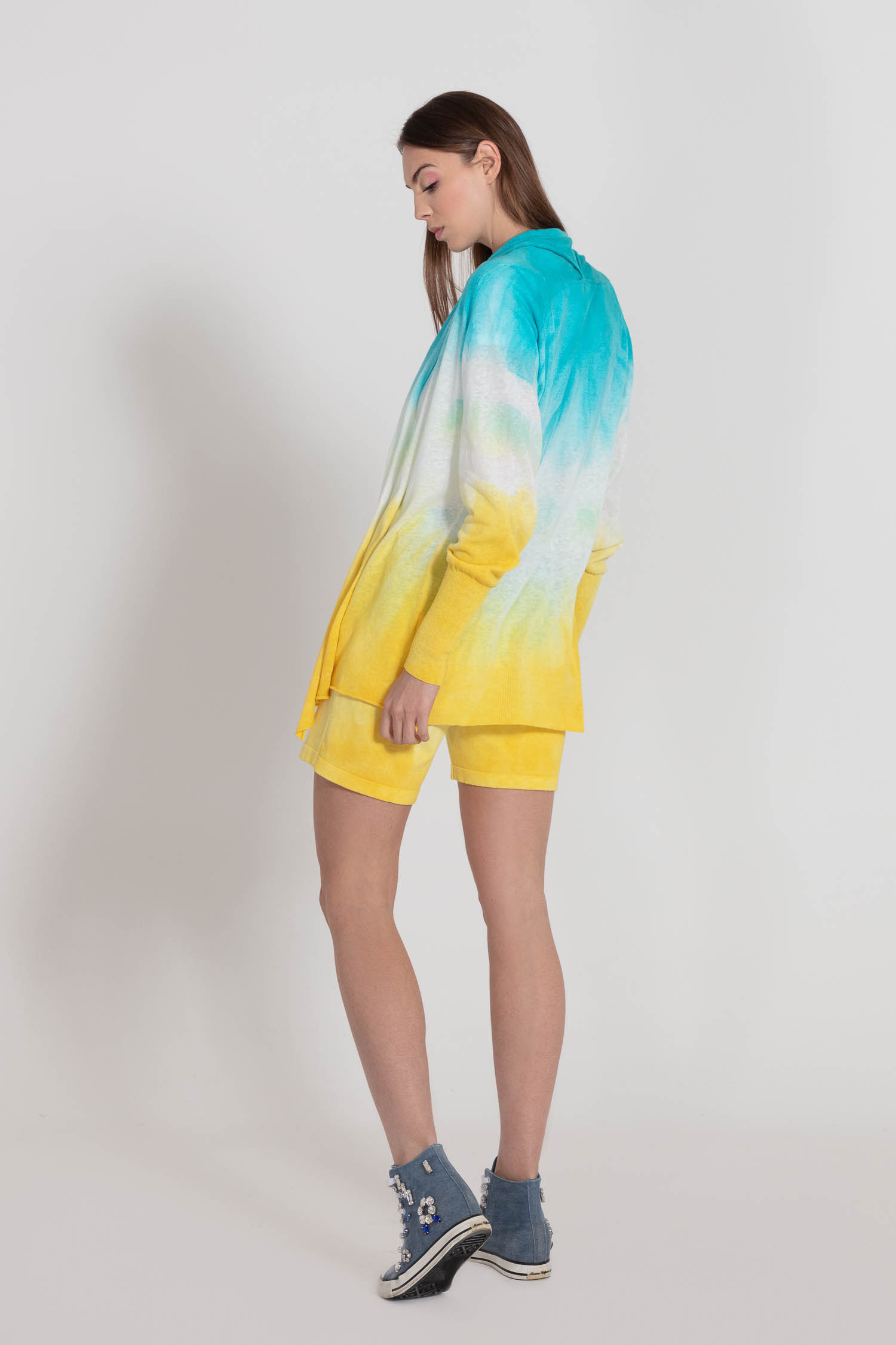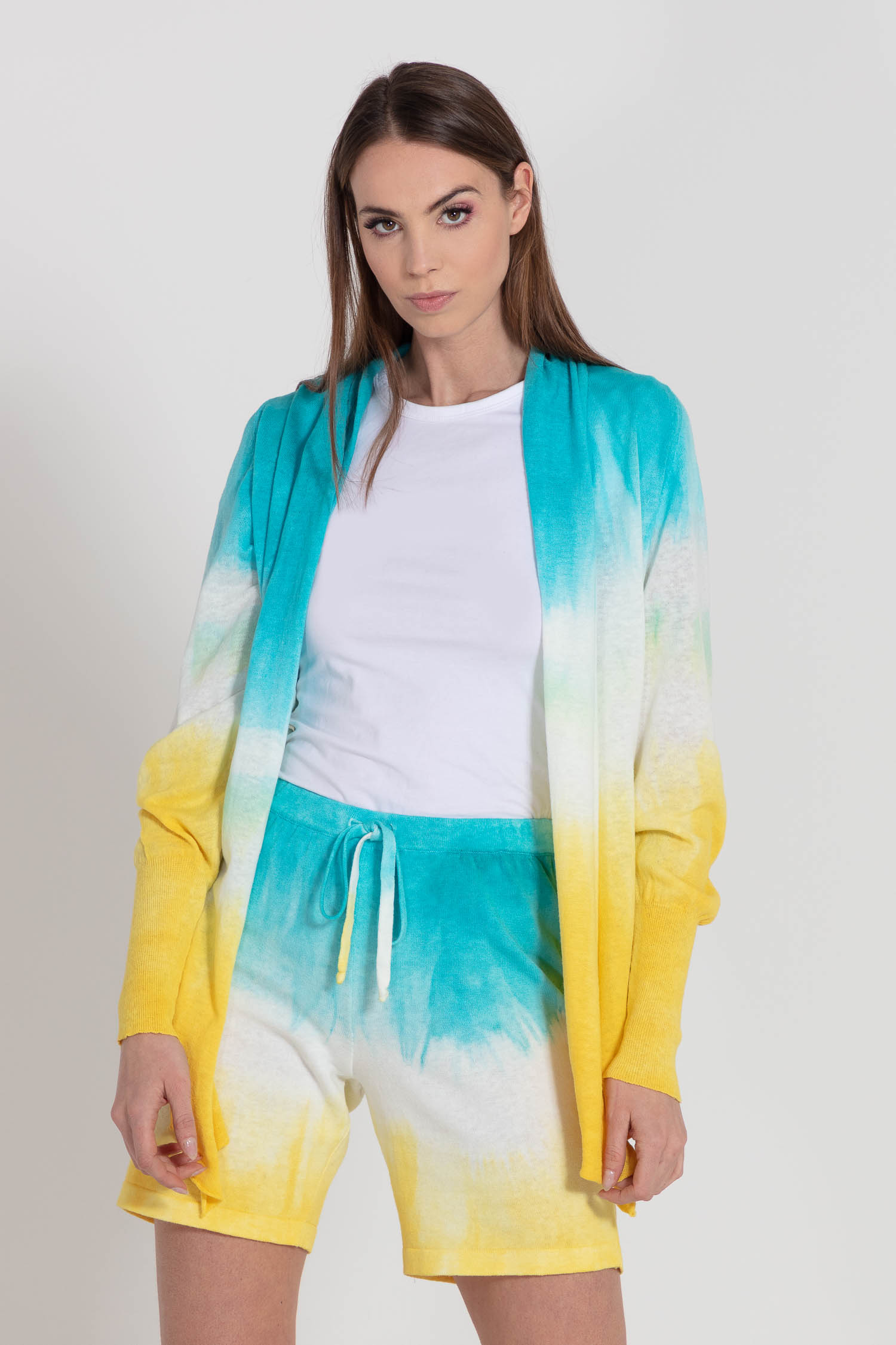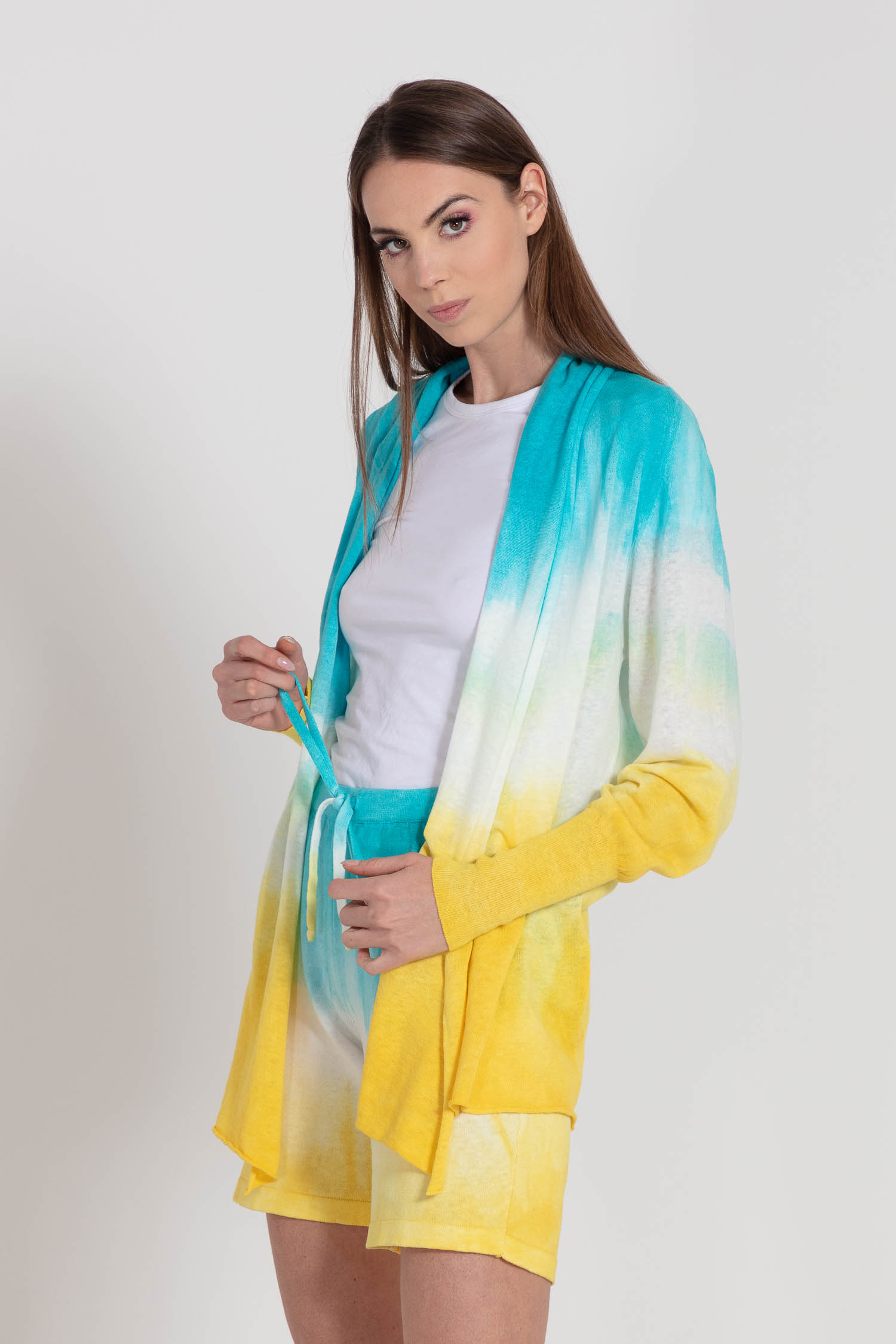 Aperto sul davanti, senza bottoni di chiusura. Un capo facile ed informale, trattato singolarmente con tintura “Tie Dye” a immersione per ottenere un effetto dégradé unico.