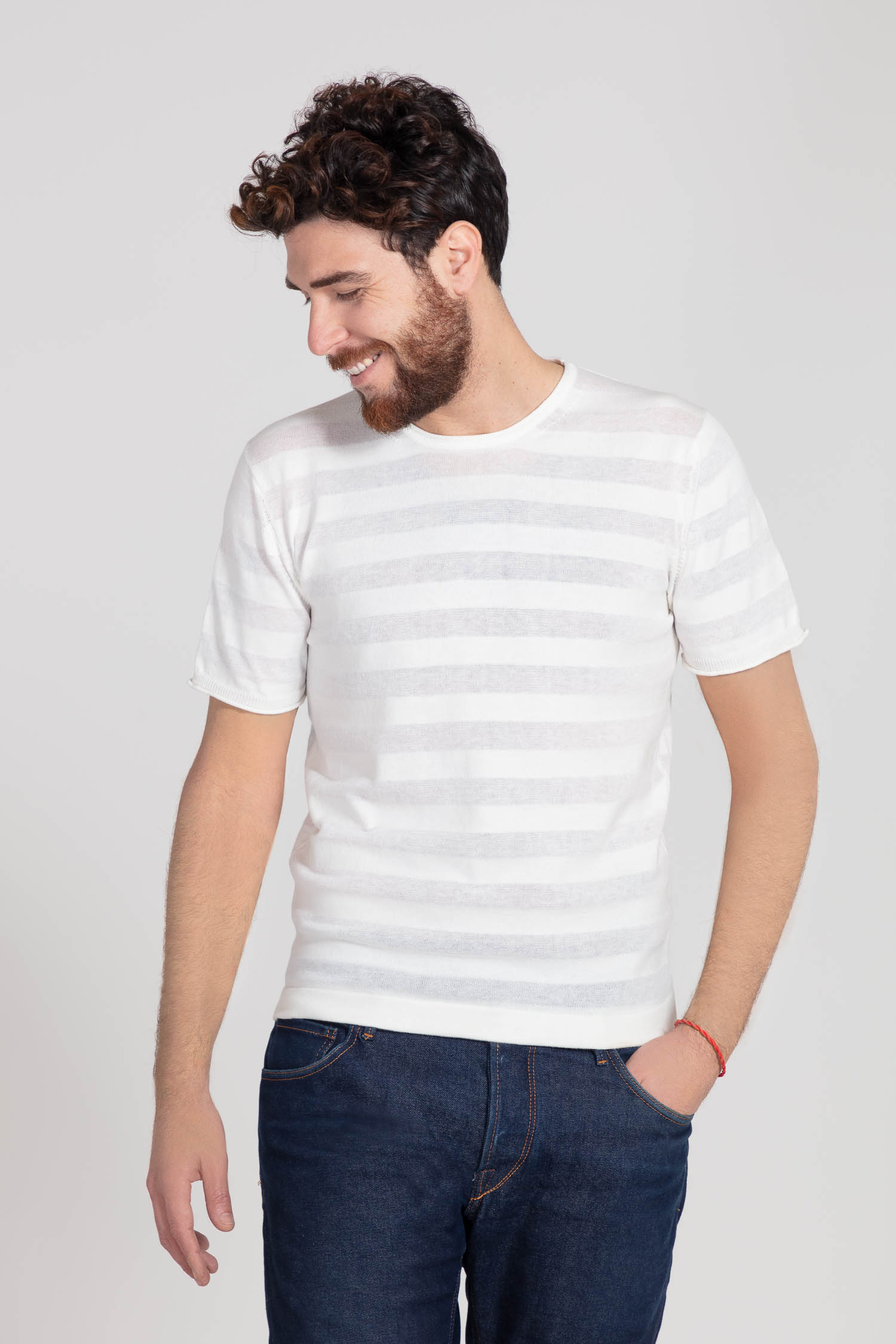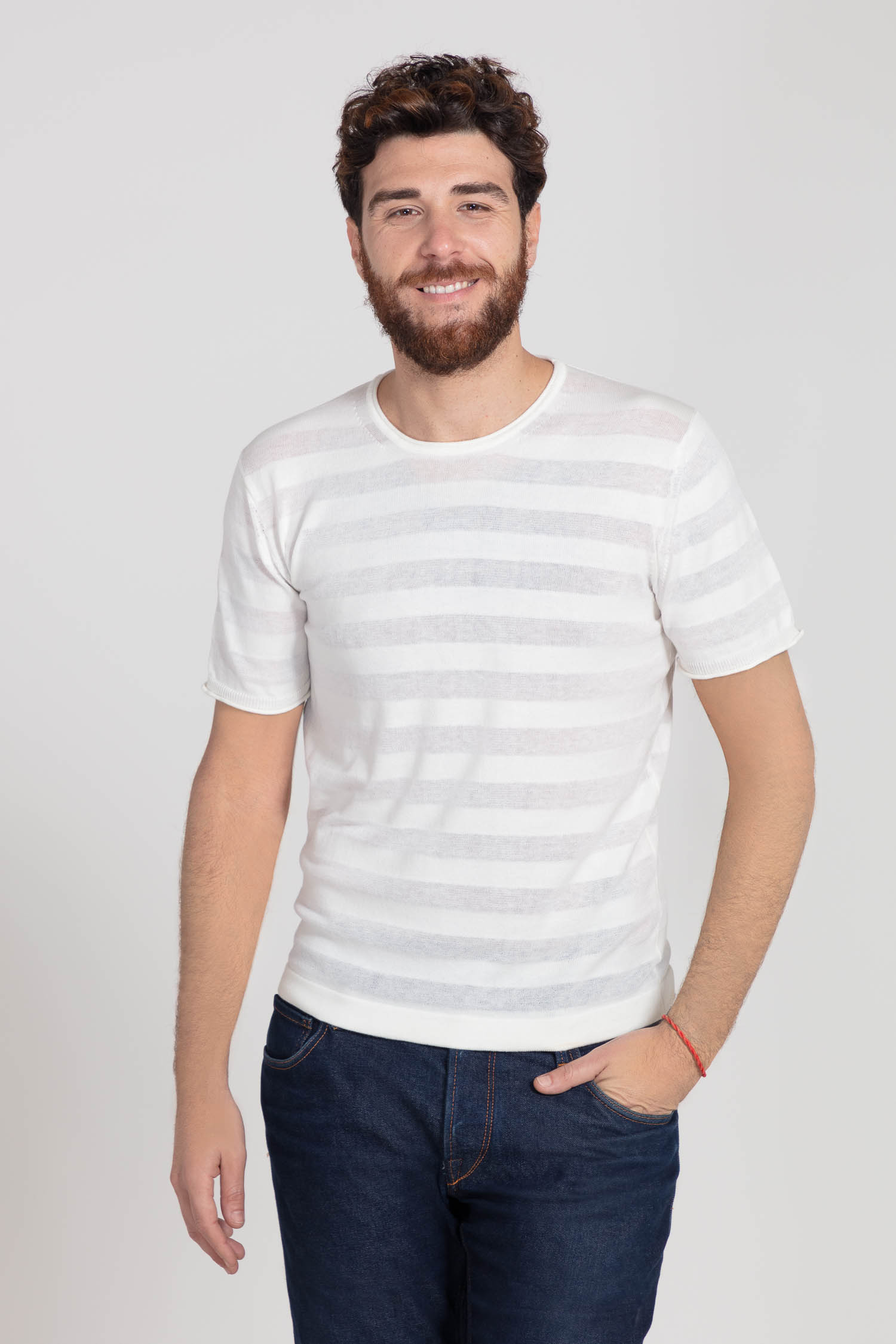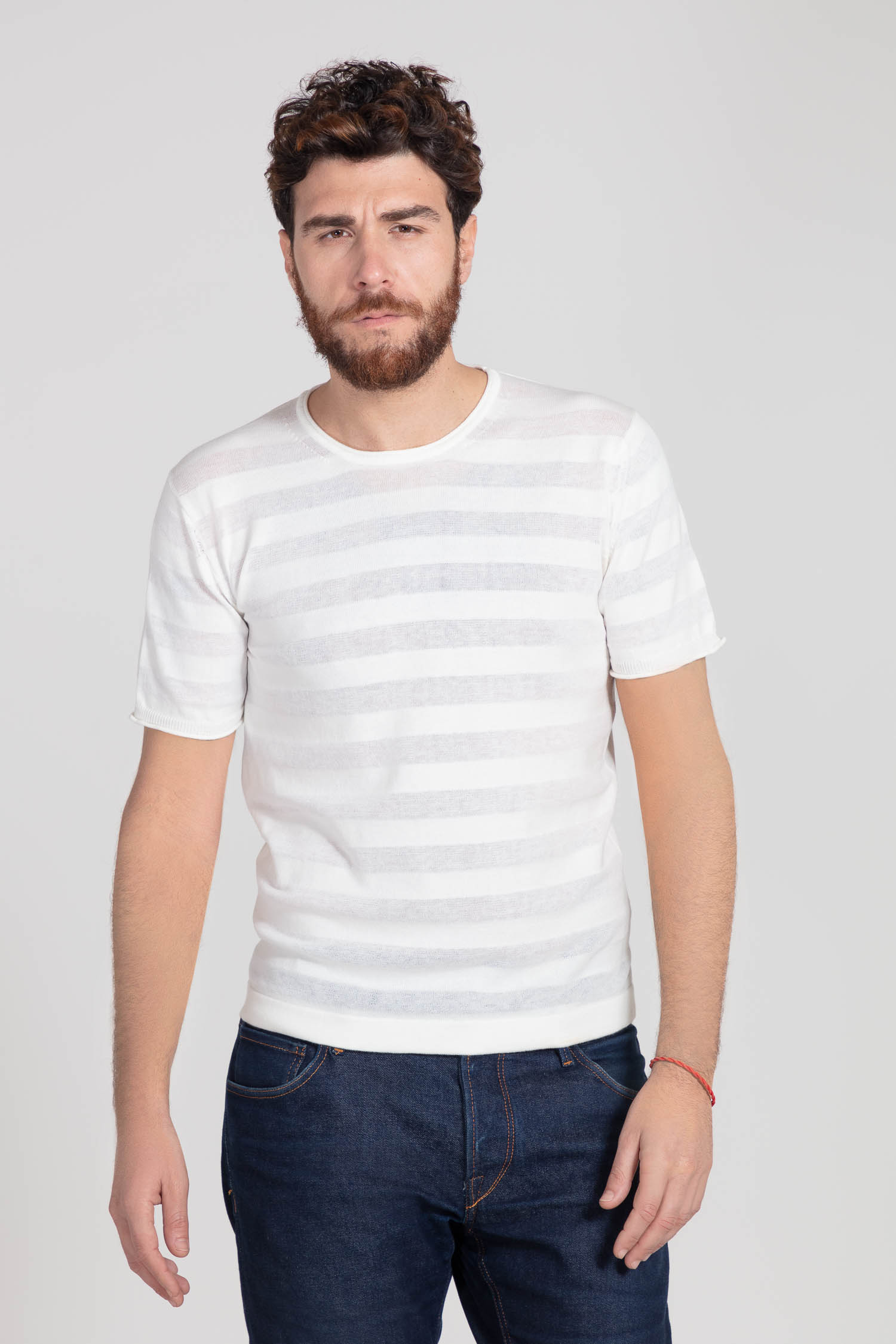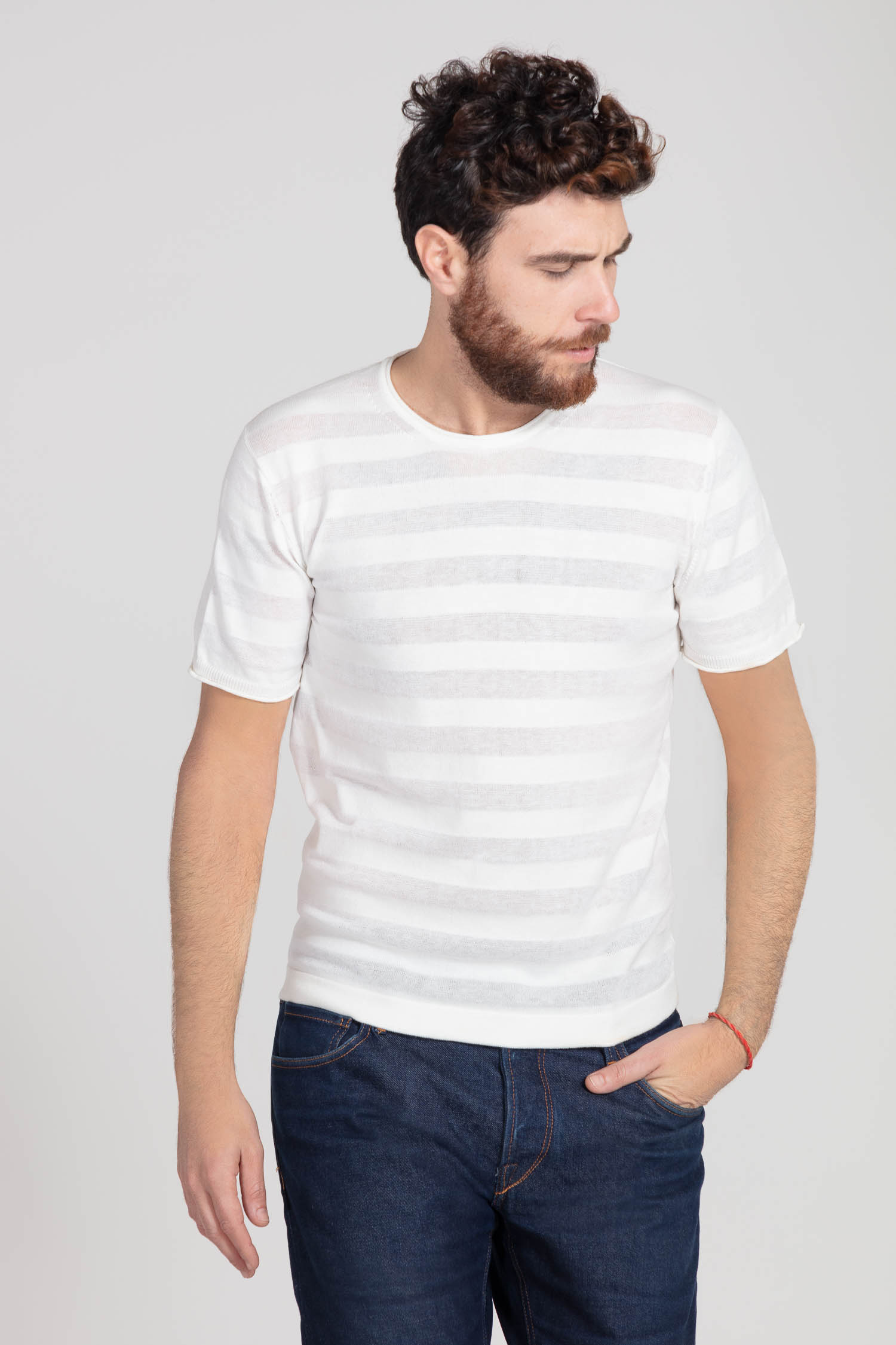 Capo semplice caratterizzato da una particolare lavorazione a righe realizzata in filati dello stesso colore ma dall’aspetto e dalla mano diversi. Il cotone mercerizzato alternato al cotone crêpe rendono questo capo un pezzo unico dalle rifiniture ricercate.