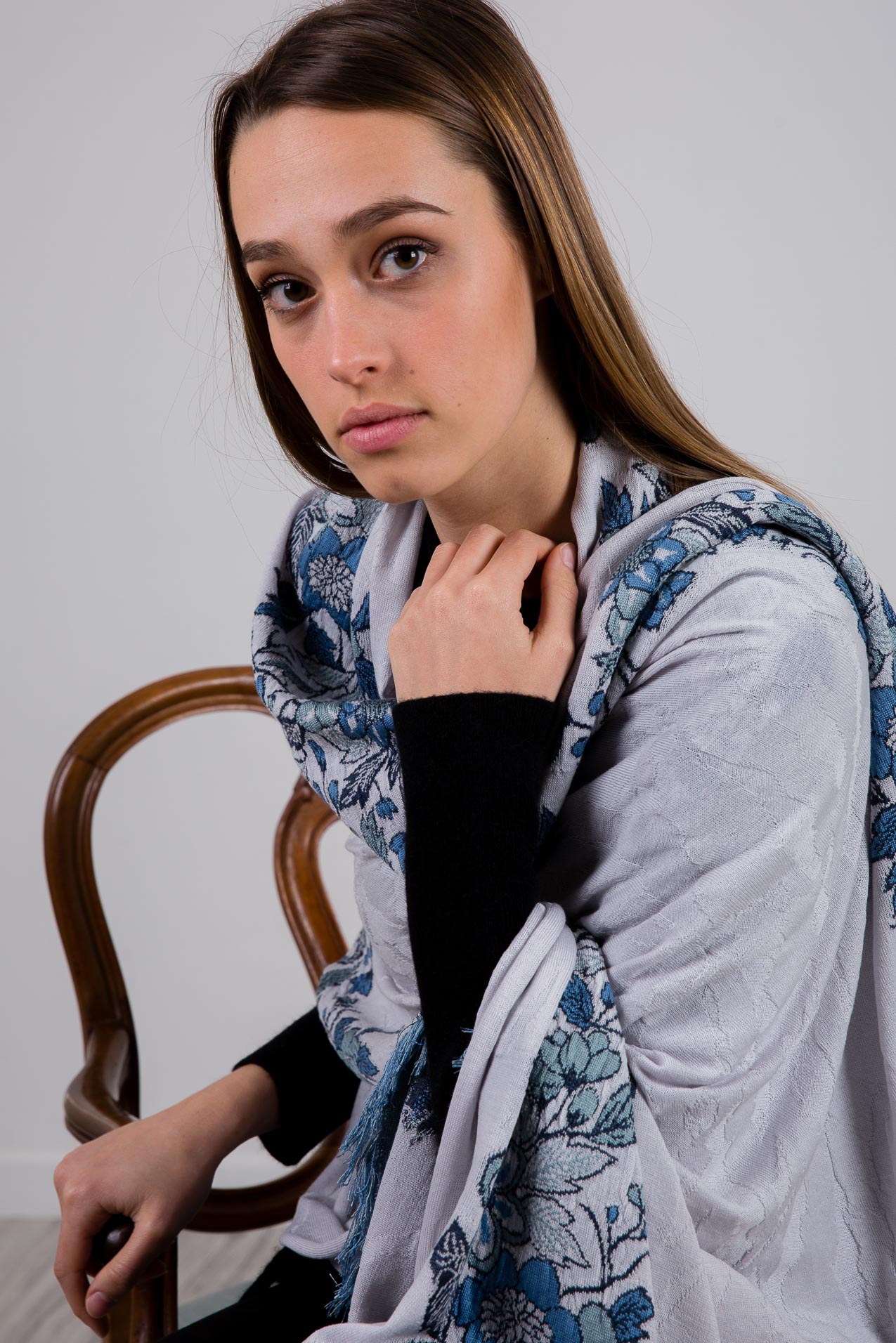 Stola in Lana con intarsio floreale e frange in seta